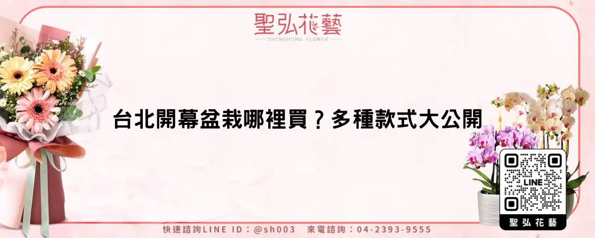台北開幕盆栽哪裡買?今天就來推薦一間優質的花店「聖弘花藝」,他們不僅提供盆栽、花籃,連開幕必備的招財藝品也有,給客戶多樣化的選擇,當您要訂購時,只要加入LINE官方帳號:@sh001,就能隨時聯繫24小時線上客服詢問訂購。所以,台北開幕盆栽哪裡買?找「聖弘花藝」就對了!