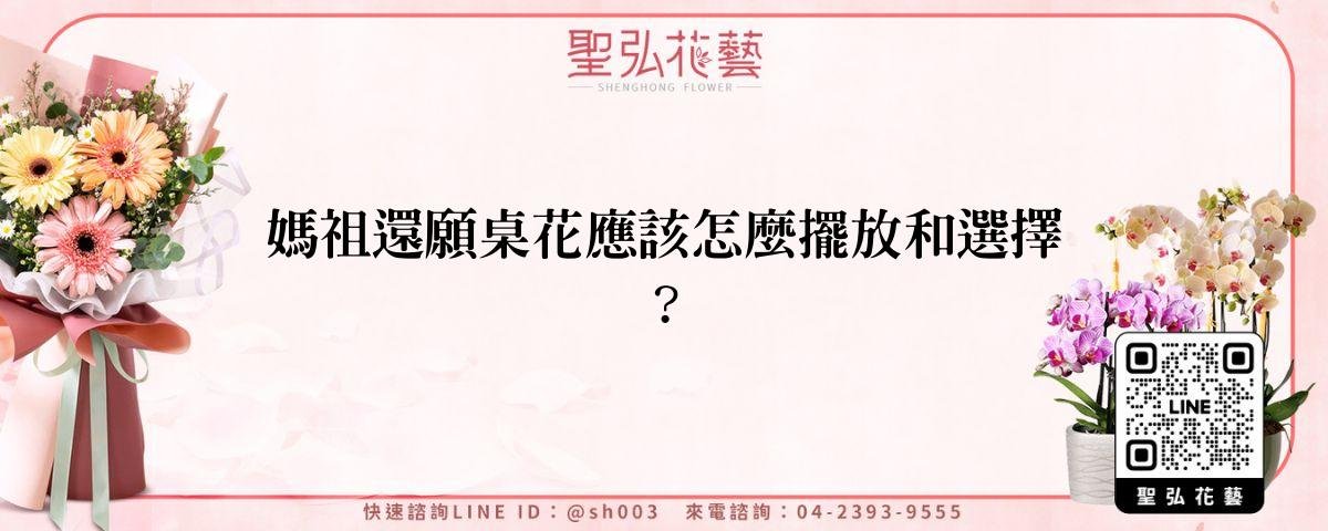 媽祖還願桌花在傳統習俗中既是禮物也是儀式的一部分,選對花材、講究擺放與遵守禁忌,能讓還願儀式更順利、也更能表達誠意。聖弘花藝熟悉台灣各地廟宇與民間習俗,長期提供還願桌花、敬神花籃、祝賀蘭花與盆花等專業花藝服務,可協助完成合乎禮節的花禮配置。