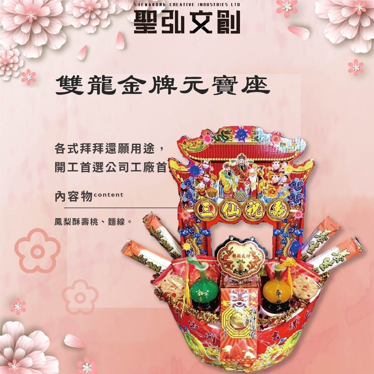 產品內容物:壽桃壽麵、吉祥飾品、招財錢母、雙龍金牌