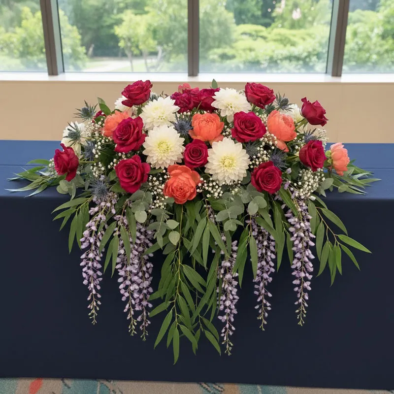 此款為:「會議講桌花」款式 桌花用途:開幕、祝賀、追思 皆可設計 – 桌花含意: 整體儀式感,讓現場更有層次與質感。 營造浪漫與優雅氛圍。